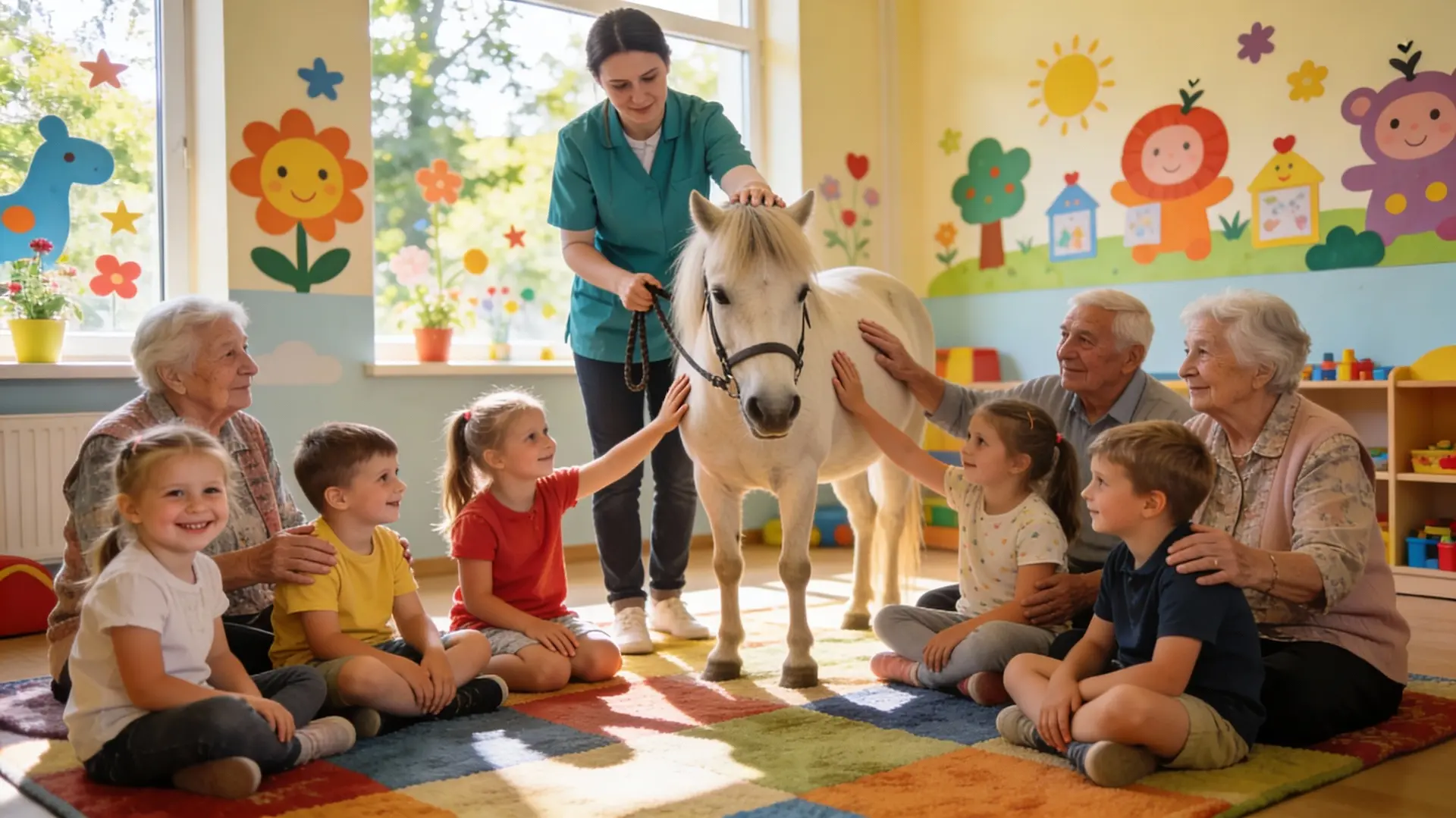 Děti i senioři prožijí hlazení, objímání a interakci s poníky, která podporuje relaxaci, sociální vazby a emoční pohodu.